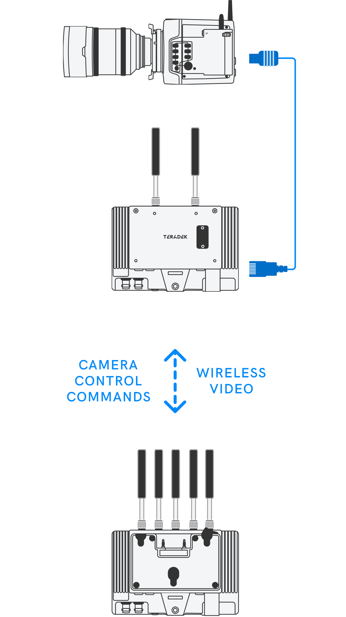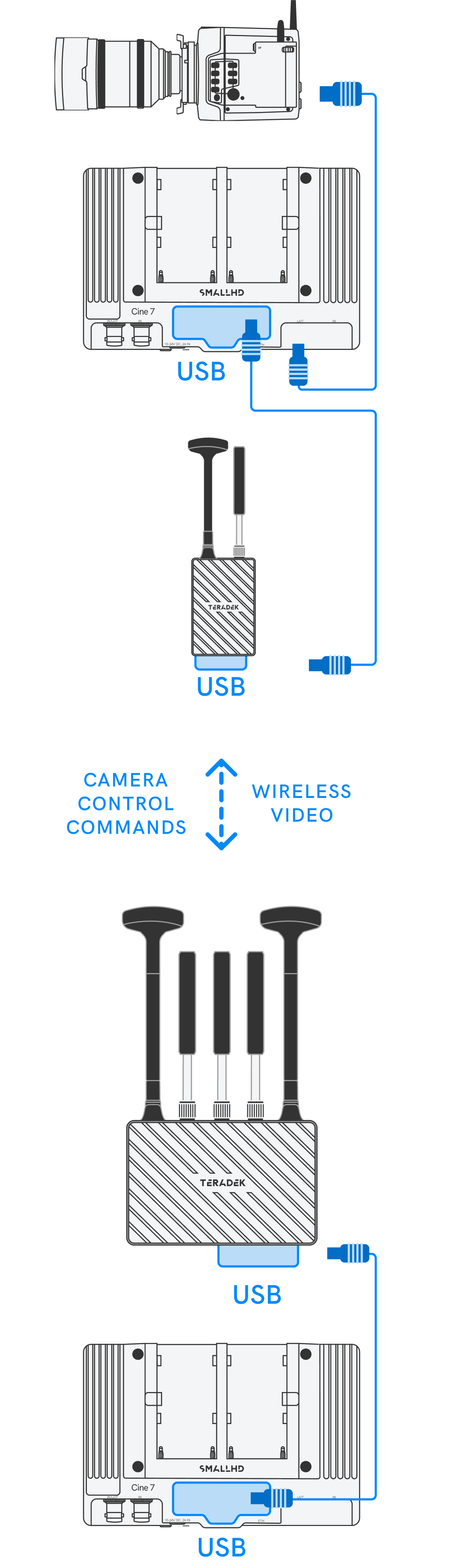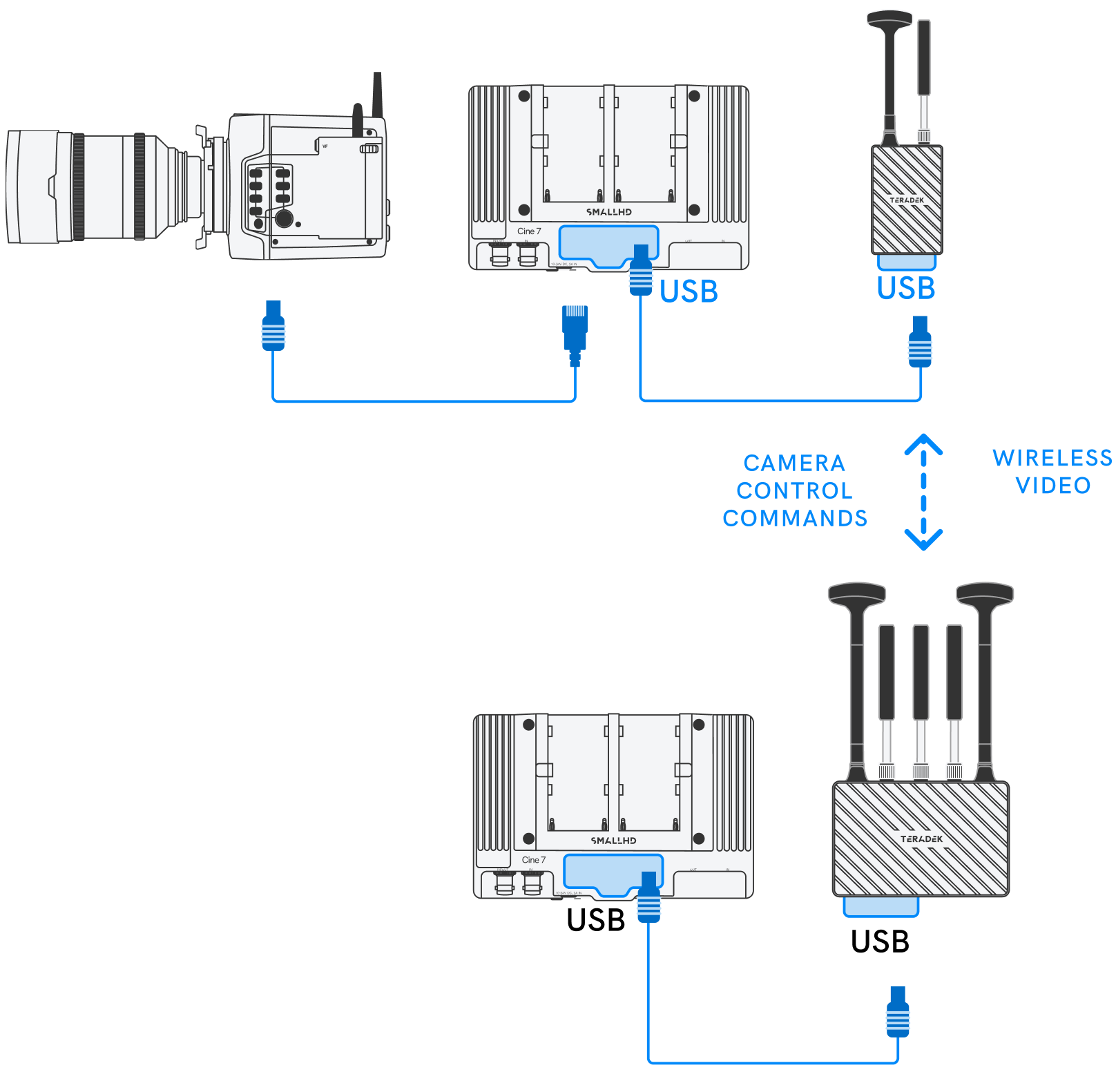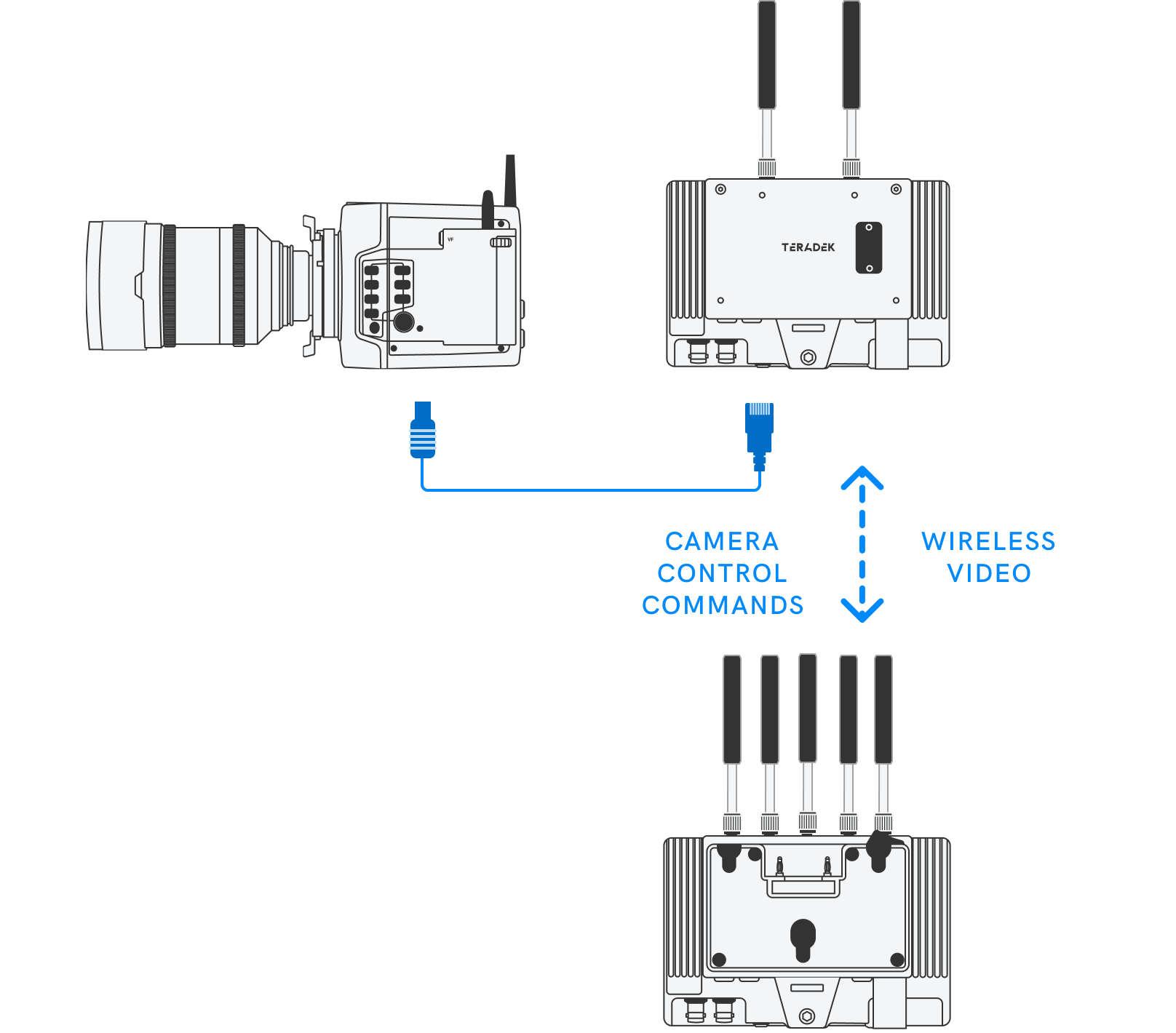 An example of our previous wireless camera control workflow uses two SmallHD Smart 7 or Ultra 5 (TX or RX) Monitors. One of these monitors is equipped with a Teradek Bolt 4K/6 Monitor Module TX and is connected to the camera with a camera control cable. The second Smart monitor has a Teradek Bolt 4K/6 Monitor Module RX attached. After installing a camera control license* on either of our monitors, you can send camera control commands from your RX monitor.