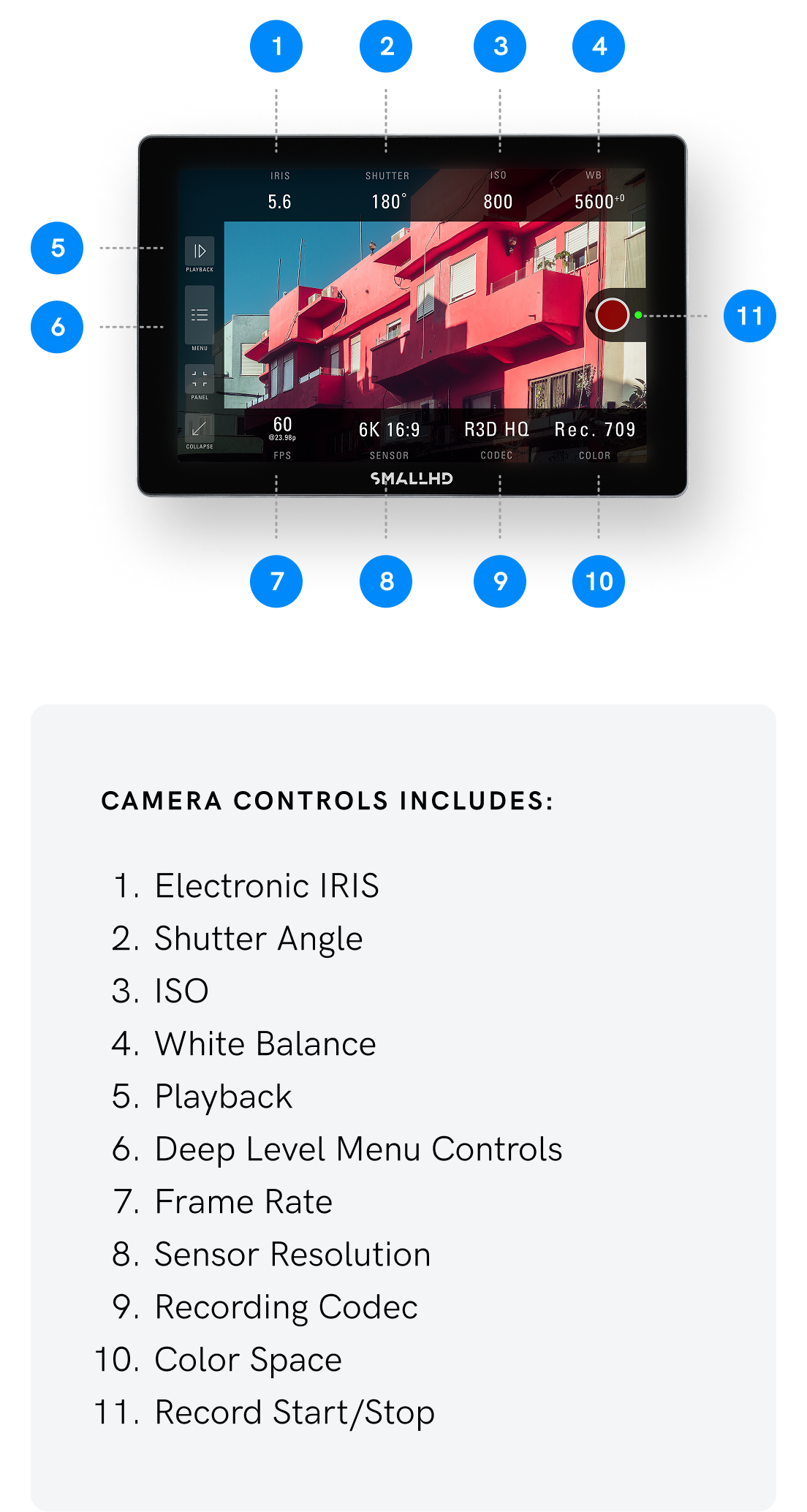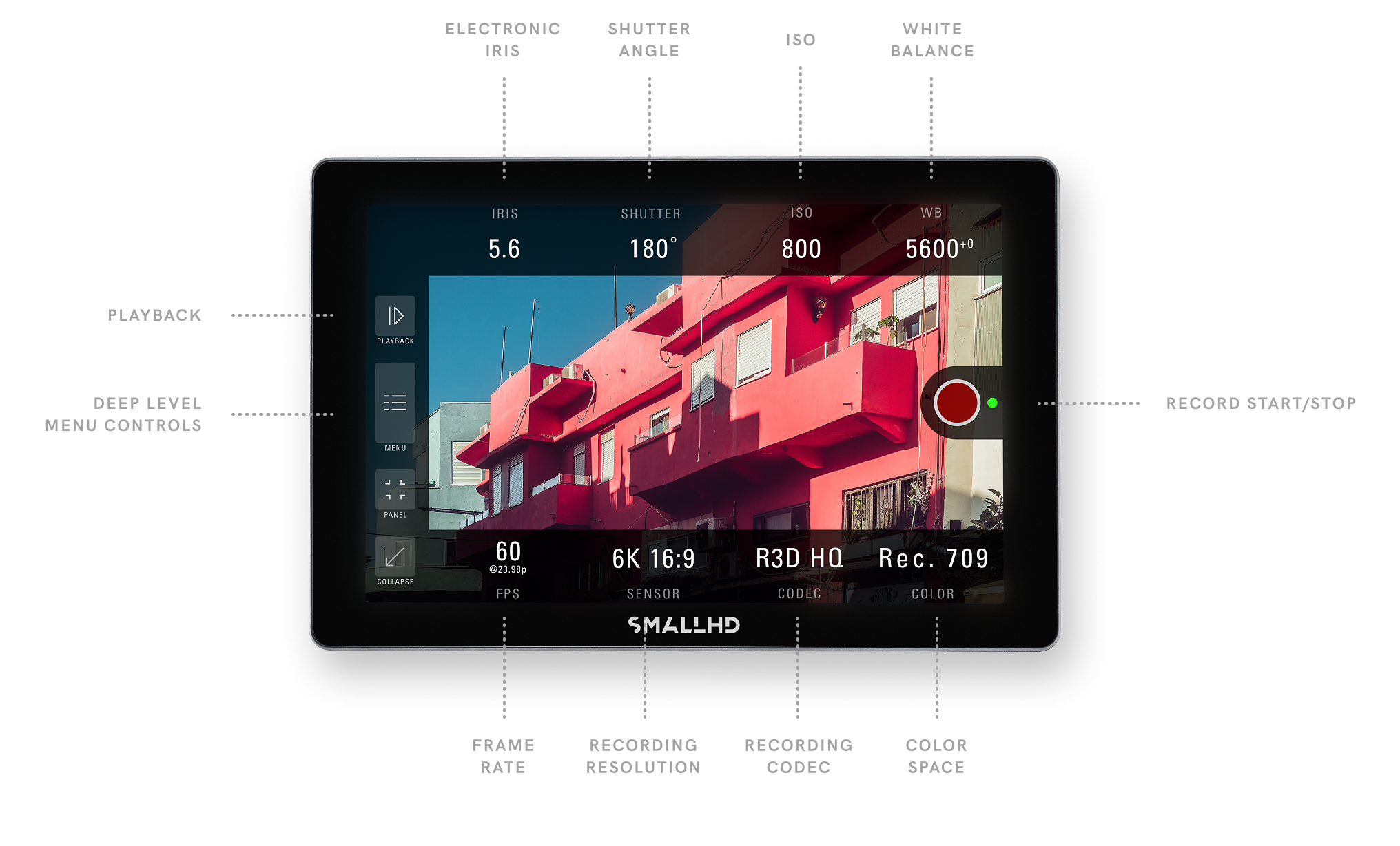 When using Wireless Camera Control, your SmallHD monitor becomes the off-camera command station. Controlling your white balance, shutter angle, and trigger start/stop record are just a few critical functions you have at your fingertips.