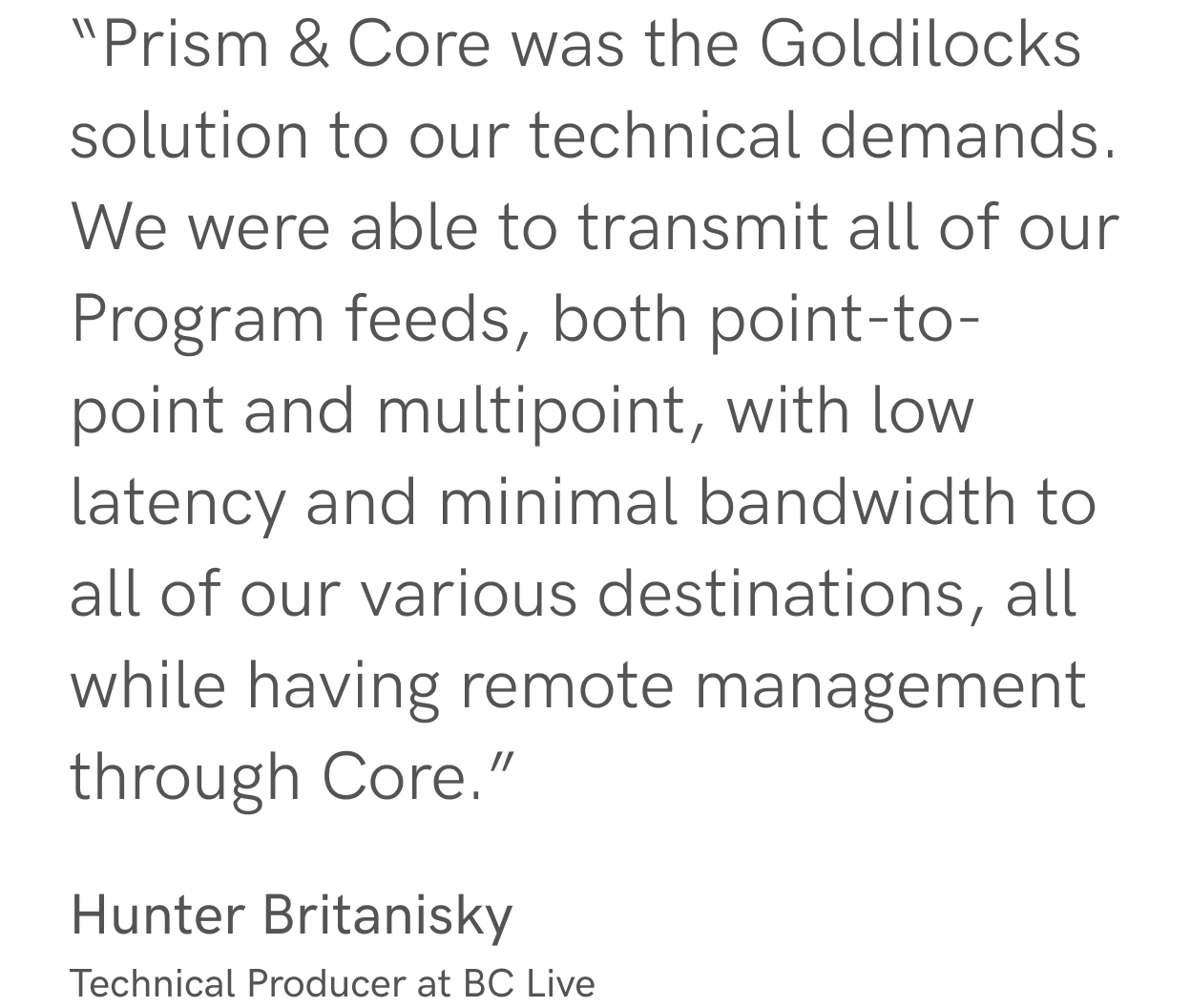 Using the festival network, BC Live placed a Prism Flex encoder at each stage’s control room and managed all transmission destinations using Teradek’s on-premise and cloud orchestration platform: Core. All Prism Flex devices were placed on a single VLAN and managed with Core’s on-premise Hyperion server to optimize on bandwidth by keeping everything local.