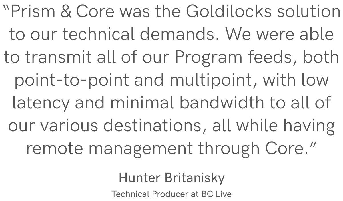 In a remarkable display of technical expertise, BC Live Productions executed a flawless transmission of Program signals across diverse stages, powered by Teradek’s Prism and Core solutions. From ensuring seamless mixing on the LED Tower displays, to the secure and streamlined monitoring solutions in Core Workspaces for stakeholders — BC Live successfully delivered an efficient and top-tier production experience, instilling confidence among show technicians and allowing everyone to concentrate on the captivating performances unfolding on stage.