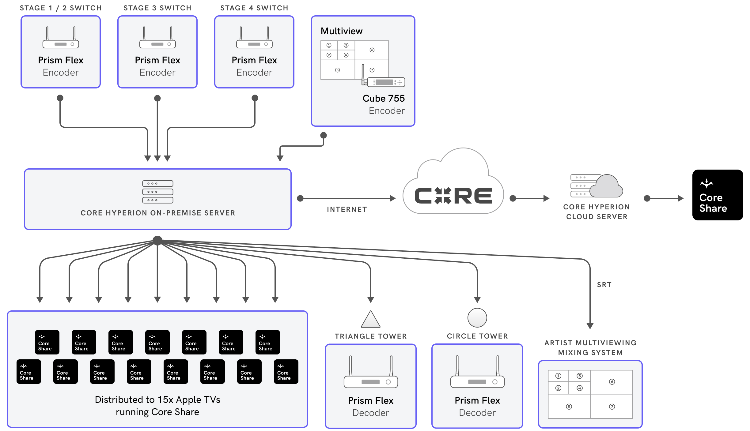 Once the Prism Flexes were installed at each stage and connected to Core, Core Workspaces were set up with security measures that assigned access to stakeholders via email and SMS. This allowed specific individuals to monitor Artists’ performances from local Production offices.Â