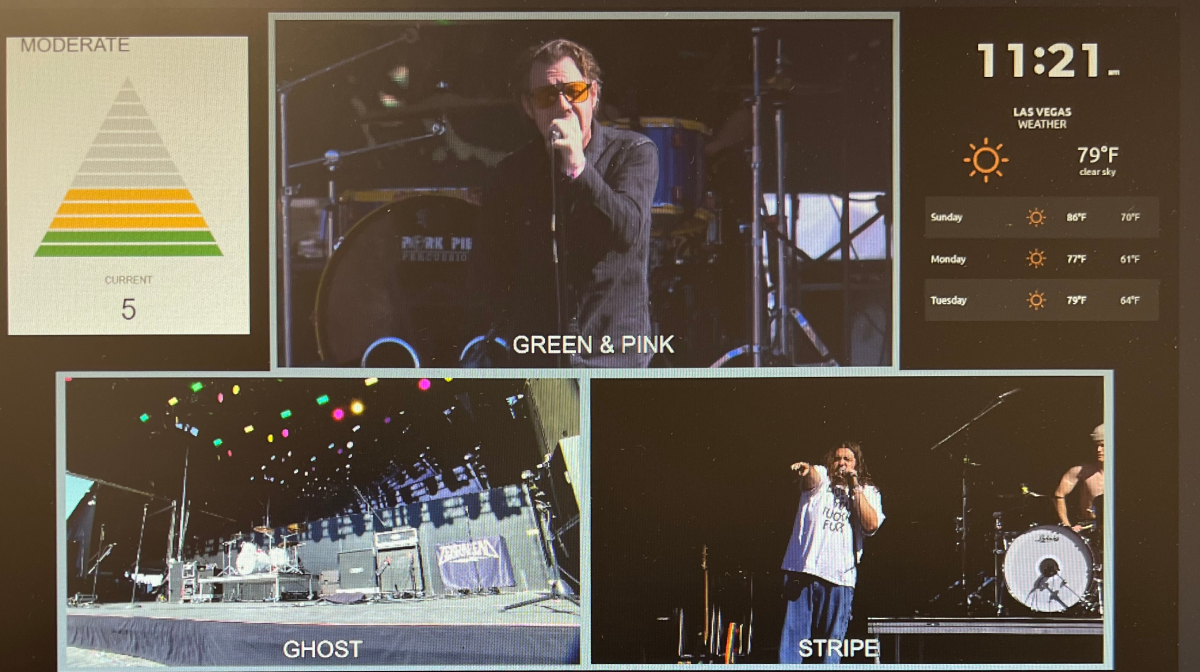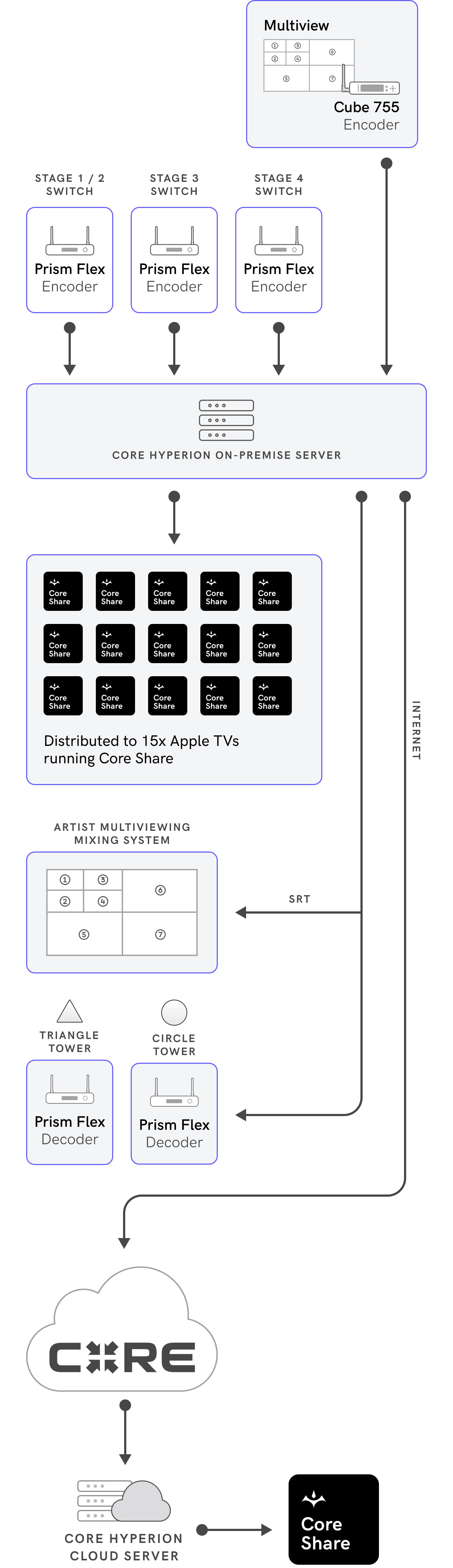 The decoder of choice was a user-friendly AppleTV4K, running the free Core TV App (now Core Share). These were placed at each Production station across the venue, and allowed the viewer to easily select which stage to monitor. The Festival Command Post also requested a custom multiview of all stages and local weather stats, which BC Live was able to create with a switcher before adding it to the Core Workspace using an additional Prism Flex encoder