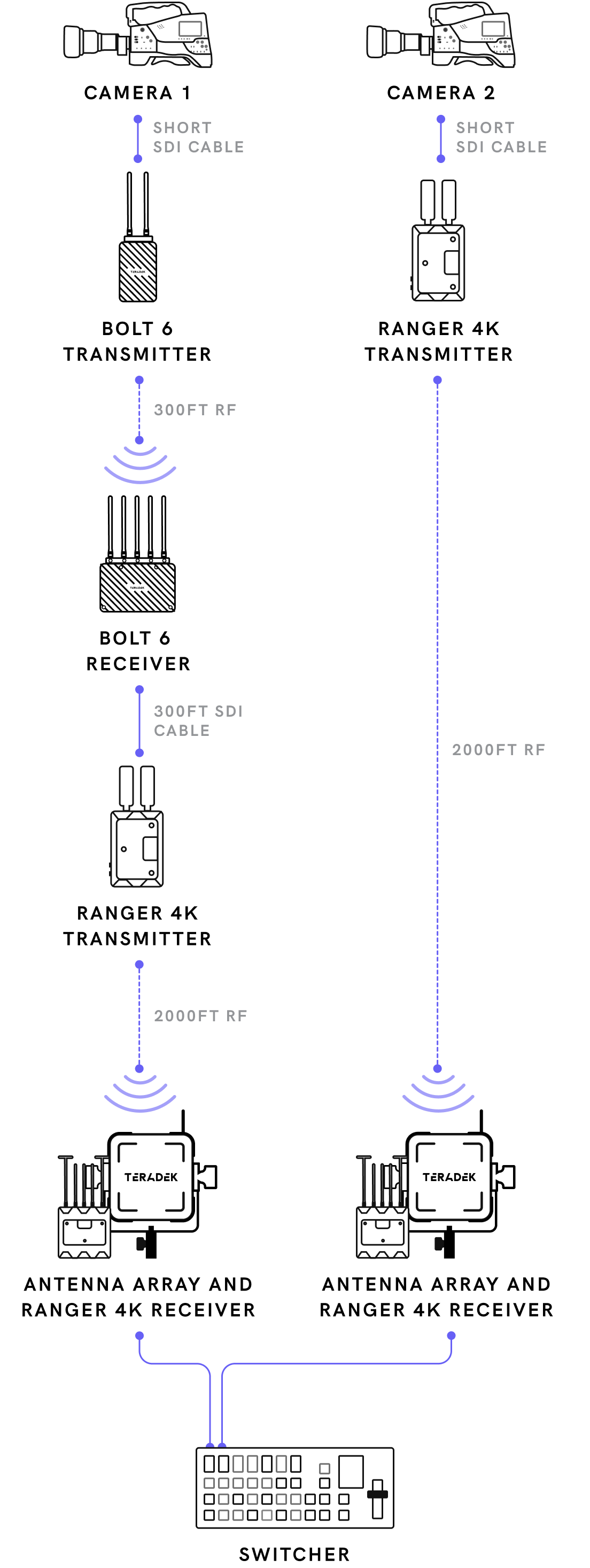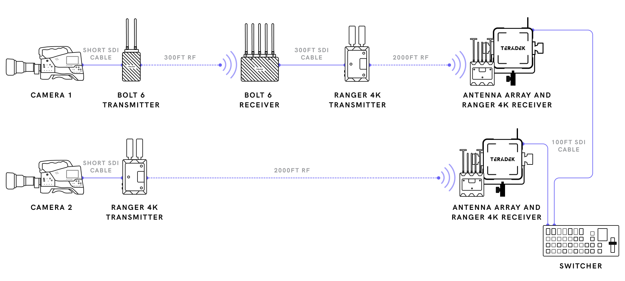 The starting line camera transmitted its feed from a Bolt 6 to a receiver located 300 ft away, which was then connected to a Ranger 4K via a 300 ft SDI cable. This Ranger subsequently transmitted the footage an impressive 2000 ft further to its receiver alongside the broadcasting van, covering a total distance of 2,600 ft. The camera at the midway point utilized a Ranger 4K to transmit its footage to a receiver positioned 2,000 ft away.