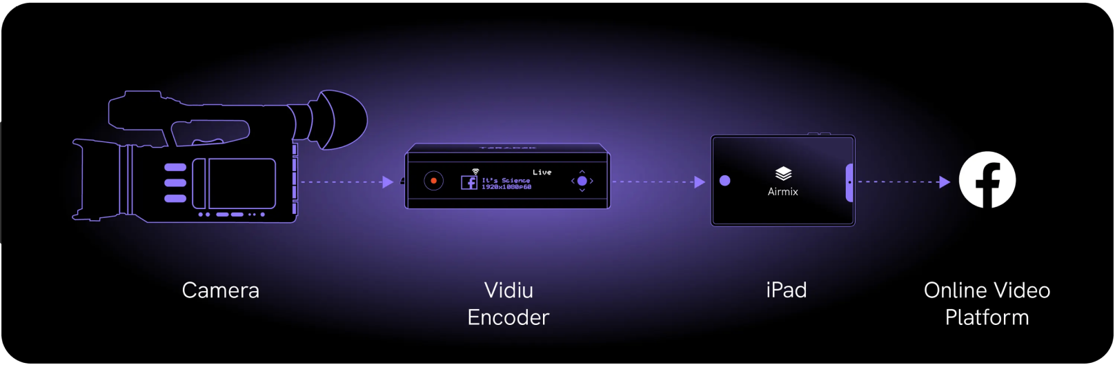 Want to combine the robust features of Airmix with this camera setup? Teradek’s Vidiu line of encoders can send a camera’s video and audio signal straight to Airmix! This will allow you to use both the iPad and your camera/camcorder as an additional angle.