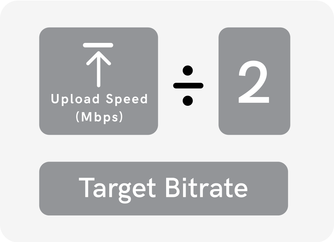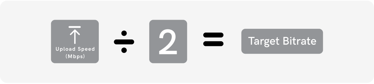 Some may suggest an overhead of 30-40% of your available bandwidth. But for safety, we suggest giving a 50% overhead. Wait, so what is my bitrate setting? Let’s do some easy math. Take your upload speed measurement from your speed test, then divide it by 2 and you’ll have your target bitrate.