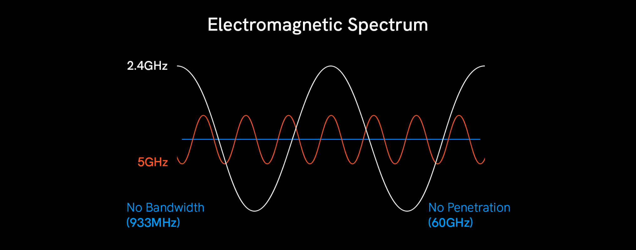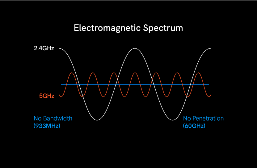 In the electromagnetic spectrum, we commonly use the 2.4GHz and 5GHz bands to wirelessly transmit signals so you can use the internet on your phone, ask Alexa to turn off the lights, and much more. If you were to use lower bands such as 933MHz, the signal would not have enough bandwidth. As an example, you wouldn’t be able to watch a live football game clearly. If you were to use higher bands such as 60GHz, the signal would not have enough penetration, therefore you wouldn’t be able to use your laptop in a separate room, far from the router.