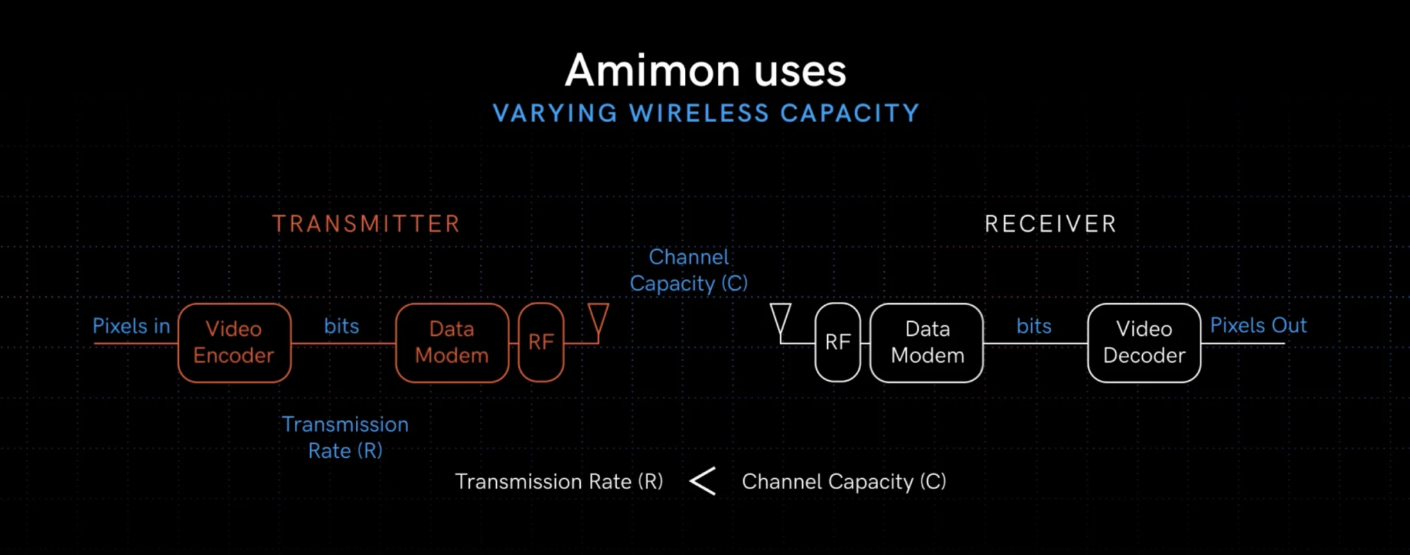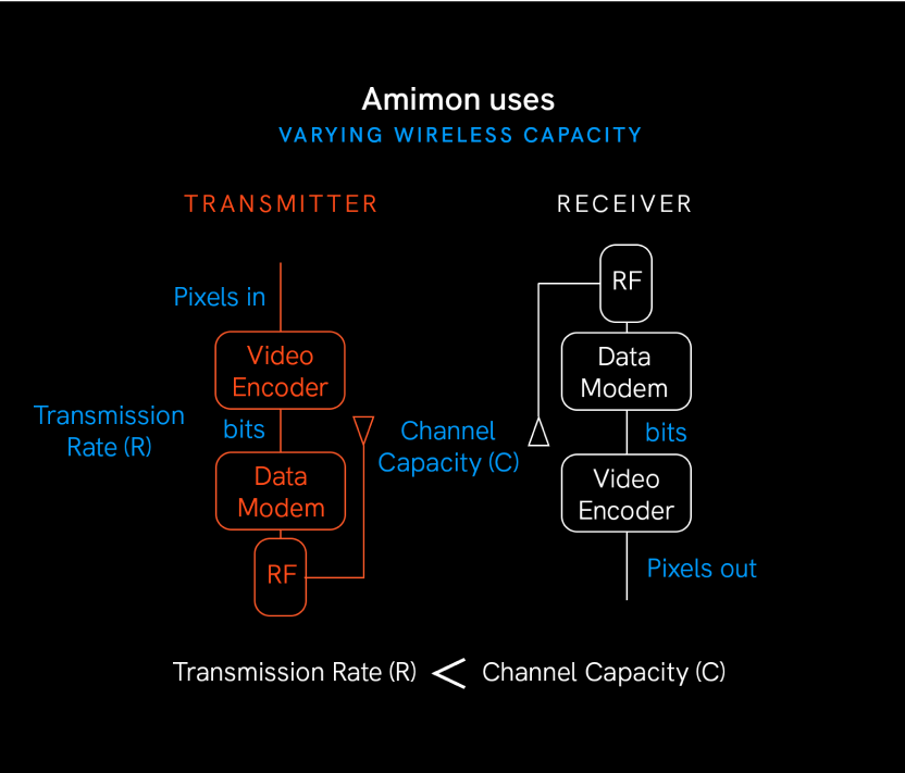 In the transmitter, the video encoder transforms pixels into bits, then streams it. The receiver is the mirror of this process, in which the video decoder transforms bits into pixels. In order to be stable, the transmission rate (R) needs to be less than the channel capacity (C). The challenge is that the capacity always changes. For example, when someone walks through the path of transmission, or if the antennas are misplaced, the channel capacity will decrease. Amimon uses varying wireless capacity to make sure R < C.