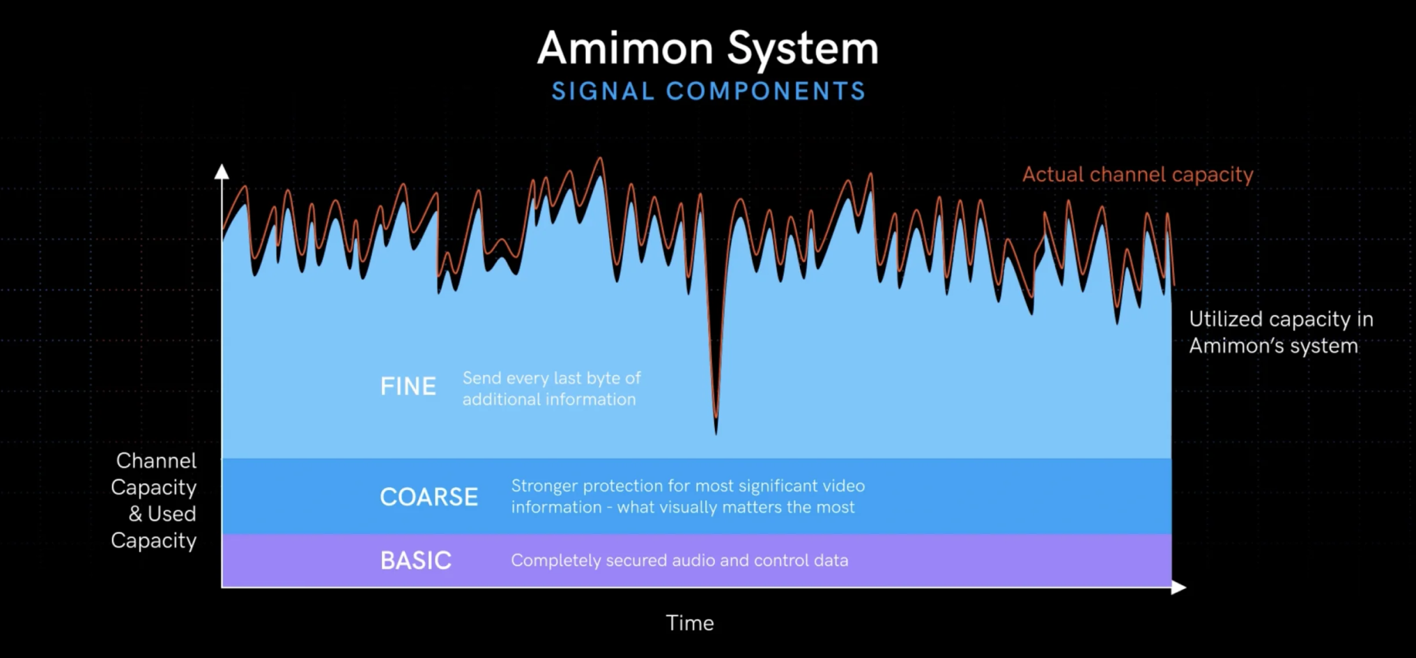 The Amimon system uses the entire channel capacity that is available, which removes the need for a buffer. The Amimon chipset bypasses buffers and low capacities through a unique technology called joint source channel coding.