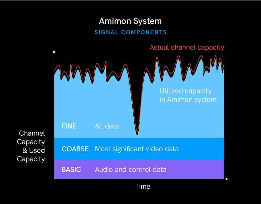 Any momentary drop in channel capacity will only affect the fine layer, as seen above in the graph. Drops will not affect latency, and it will not create a need for a buffer. The transmitter always sends everything to the receiver(s)—the basic, coarse, and fine layers—and the receivers receive the layers at their highest capacity. There is no need for the transmitter to resend frames to fill missing frames, or for the receiver to have a buffer. Each receiver, with its own channel capacity, receives as much information as is given, within its capacity. Without the need to compress or buffer video in a traditional sense, the RF channel is always fully utilized and you see pristine video with no delay.