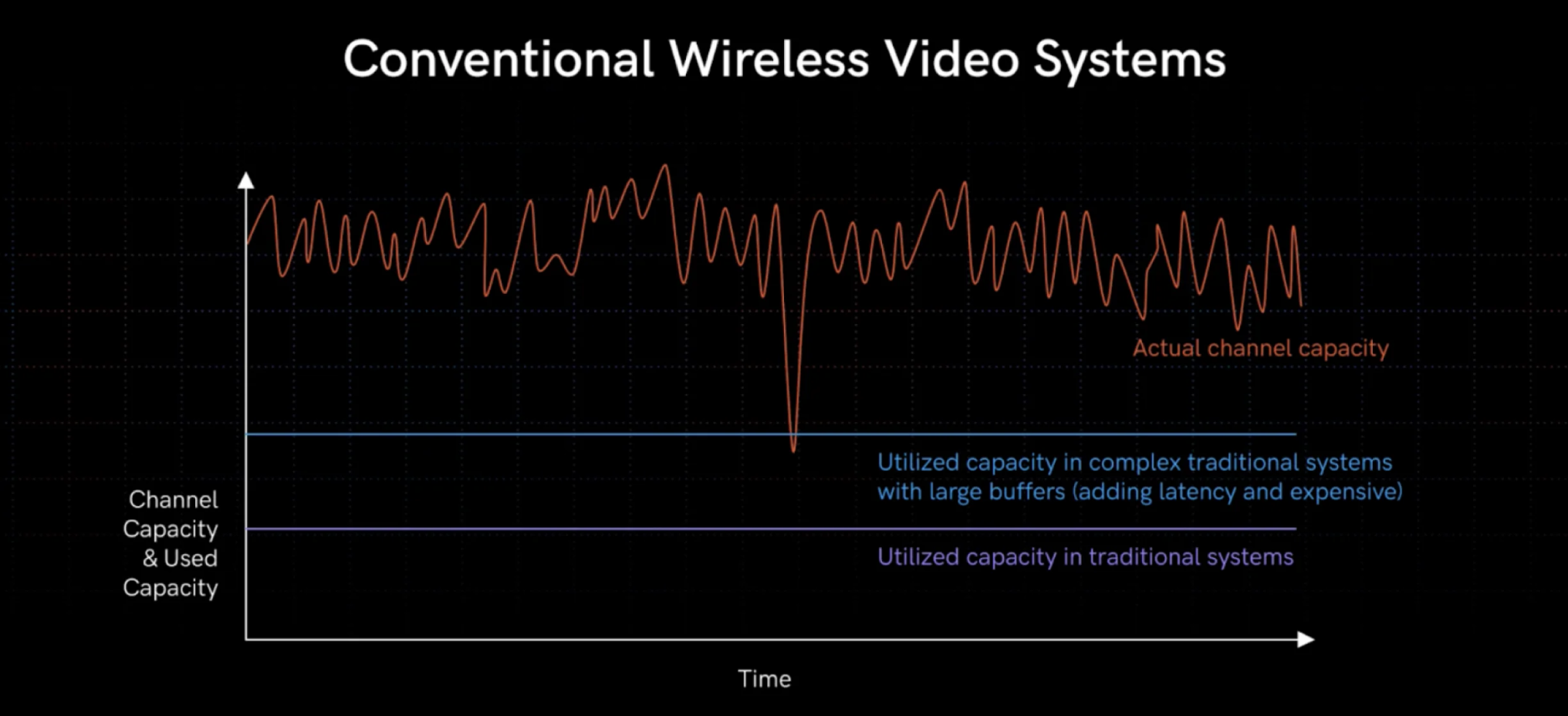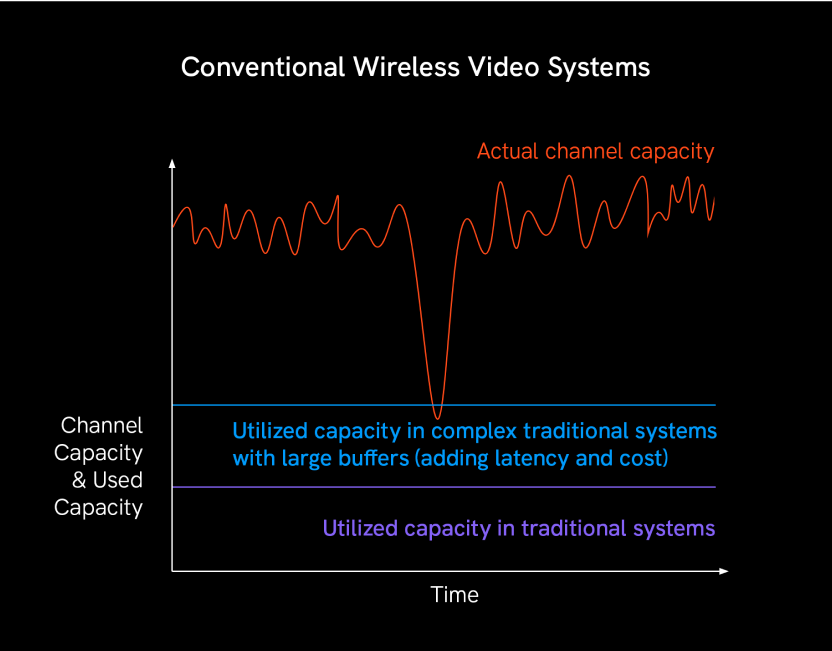 Conventional wireless video systems operate at a capacity far below the maximum, to ensure stable signals. As you might guess, you are then limited in bitrate and how much data you can send. To use more capacity, traditional systems add large buffers, which adds significant latency or drops video.