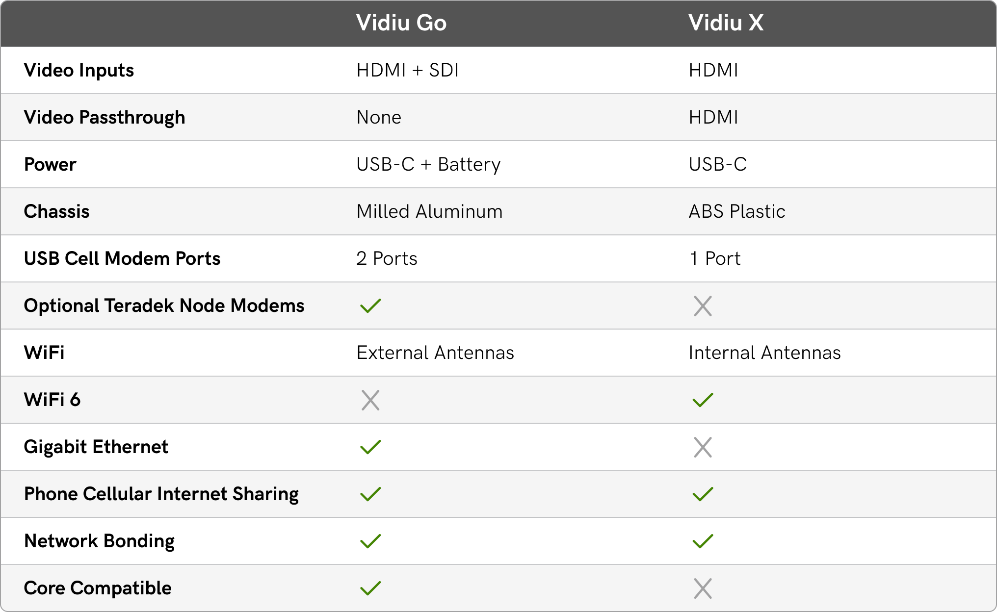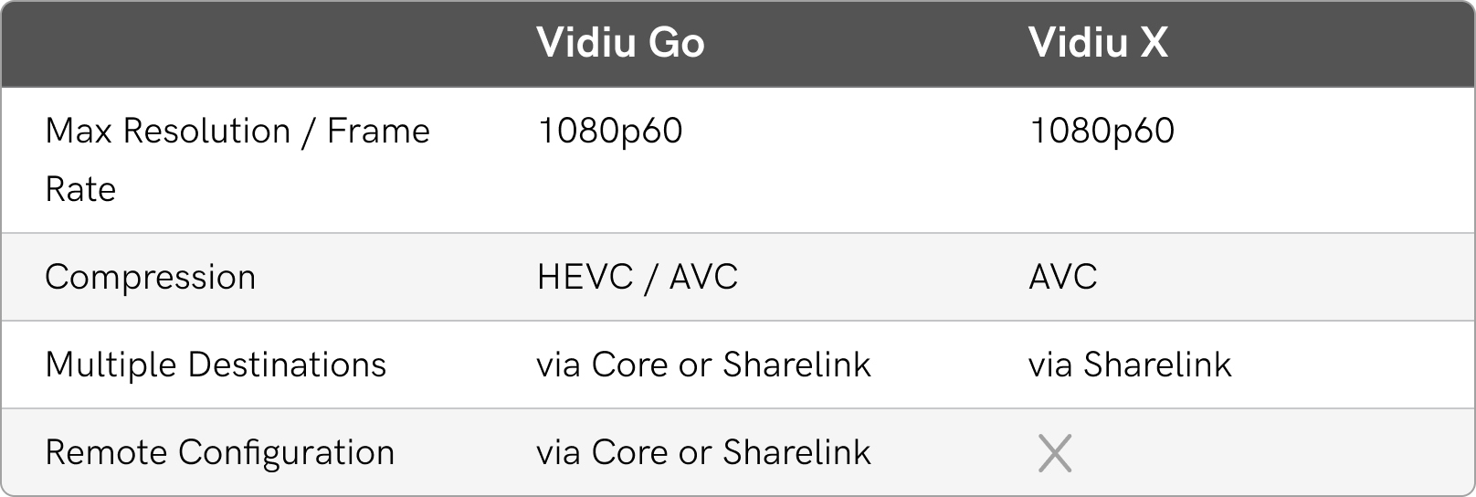 The Vidiu X can receive video from any camera or switcher that outputs an HDMI signal, typical for consumer-level gear. The Vidiu Go is able to receive video from studio-style cameras and switchers via its 3G-SDI input, more commonly used in professional-level equipment.