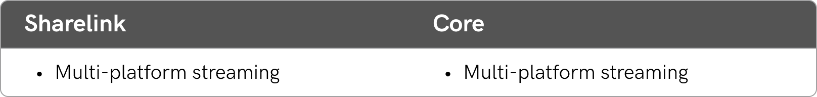 But for professionals that want to take their streams to the next level with features such as HEVC transcoding, cloud monitoring and archiving, the Vidiu Go works with Core. Let’s compare Core to Sharelink.