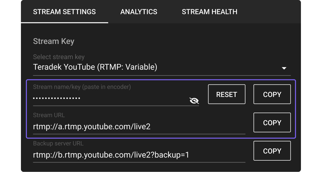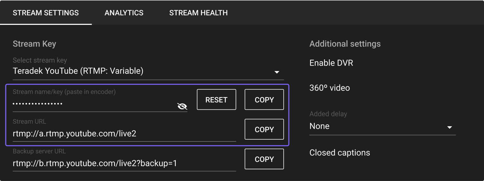 Let’s use the Teradek Wave and YouTube as an example. In the event settings of a YouTube live stream, find the ingest URL and stream key as seen here: